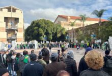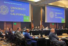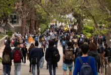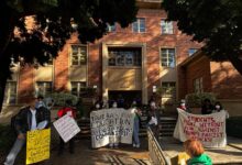 Image description: USAC Internal Vice President Tommy Contreras leads the strike across the Tongva Steps; “As students, we show up for each other, we fight for each other, and ultimately,…